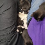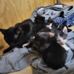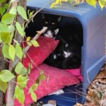 As Deanna, our Cattery Staff Supervisor was doing her evening rounds on Saturday, December 3rd, she received a message from Lynn (Cat Manager) and Shezza (Foster Coordinator) about a mom cat and 4 to 5 babies that were unfortunately dumped in Canby Park. Without hesitation, she immediately jumped into action. It was starting to get dark outside and these babies were abandoned in a heavily wooded area. Not to mention the impending freezing temperatures. Just as she was about to give up her search, she finally found them in a blue tote. The mom was severely emaciated and everyone had Coccidia (intestinal tract infection .) So she loaded them up in her carrier and promptly brought them back to Faithful Friends where Dr. Sweeney helped get them all squared away. Mama Éclair and babies Strudel, Beignet, Pettifor, Croissant, and Macaroon were all brought back to Deanna’s home to recuperate. Éclair has a long way to go to get her strength back as she was just skin and bones, but the babies are happy and thriving. With time and love, we have no doubt she will be back to her normal self and safe from the harsh cold winter that is upon us.