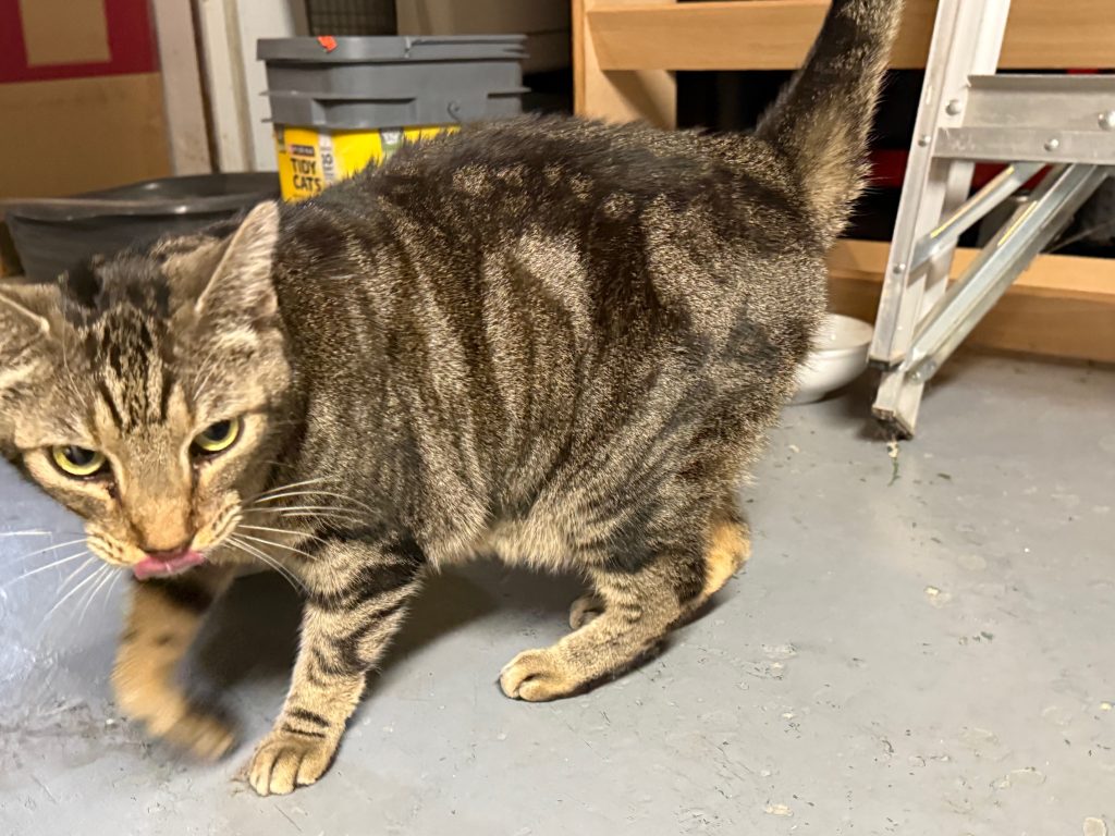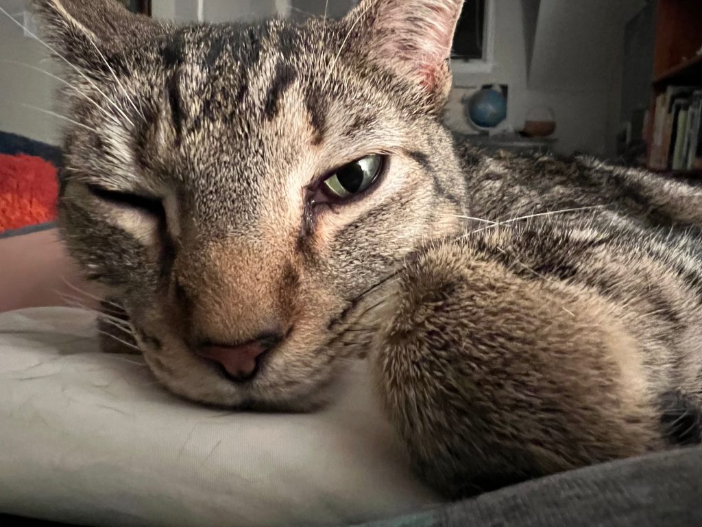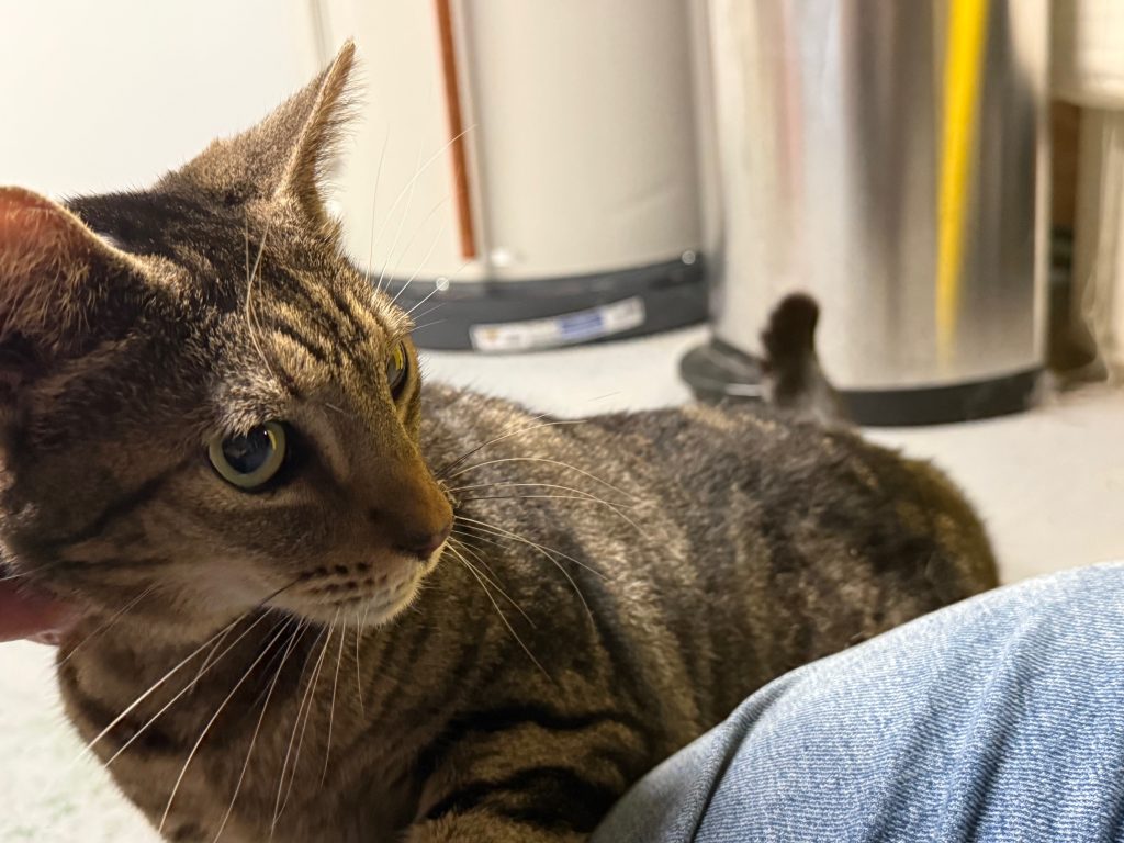 Maurice is about 4 (we think) and is extremely friendly and affectionate. He has a big personality and follows us around and talks to us often. He loves to play and happily spends most days at the window watching birds and traffic outside. He is great with kids, but we don’t know about other animals.